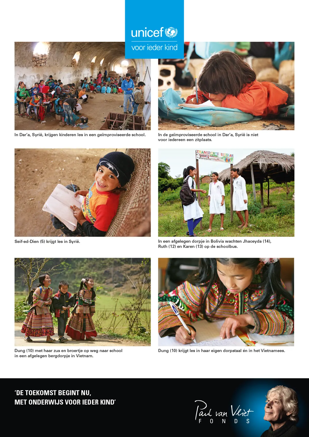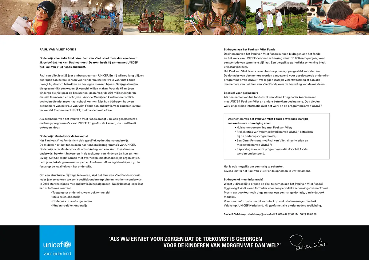 Onderwijs voor ieder kind. Paul van Vliet gelooft dat het kan, dat het moet. Daarom heeft hij samen met UNICEF dit Fonds opgericht.